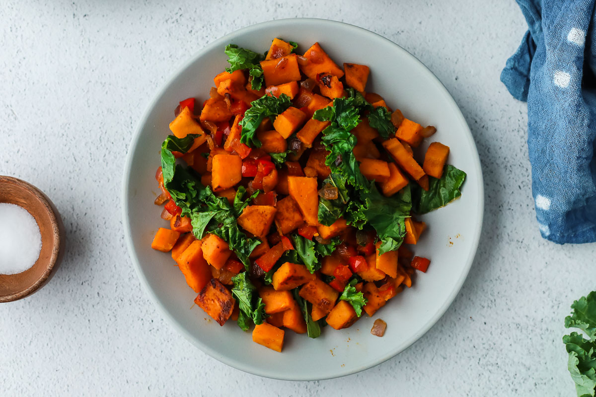 This vegan sweet potato hash is a delicious brunch recipe — but you can also enjoy it as a side dish with your favorite protein! This is a great way to add more veggies to your plate!