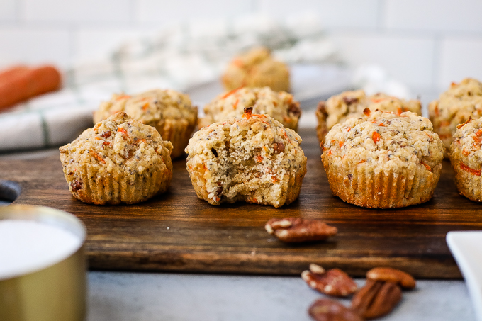 These vegan carrot cake muffins are soft and delicious, studded with shredded carrots and pecans. They’re a great breakfast for busy mornings!