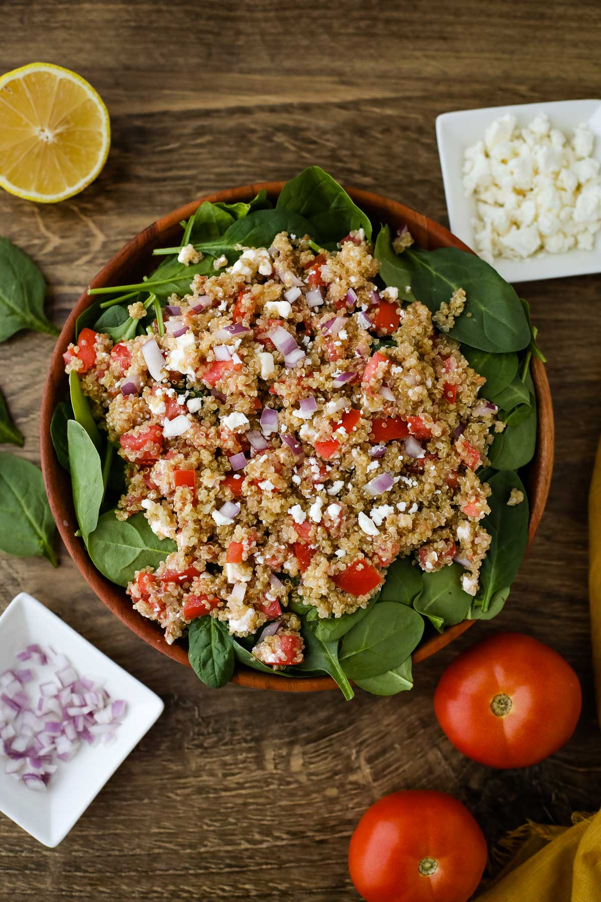 You'll need: Quinoa, spinach, feta, tomatoes, red onion, olive oil, and lemon juice